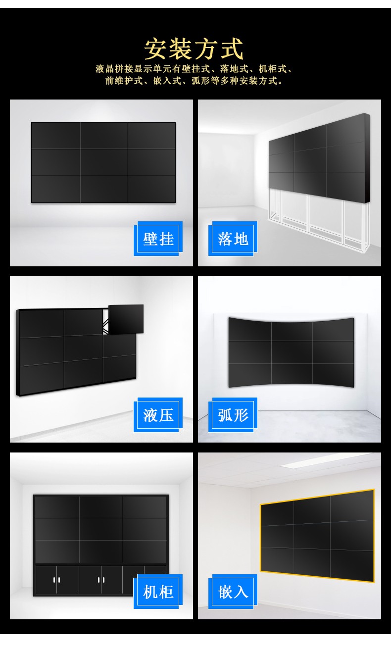 安裝方式:壁掛、嵌入式、落地機柜、吊裝、電視柜等;